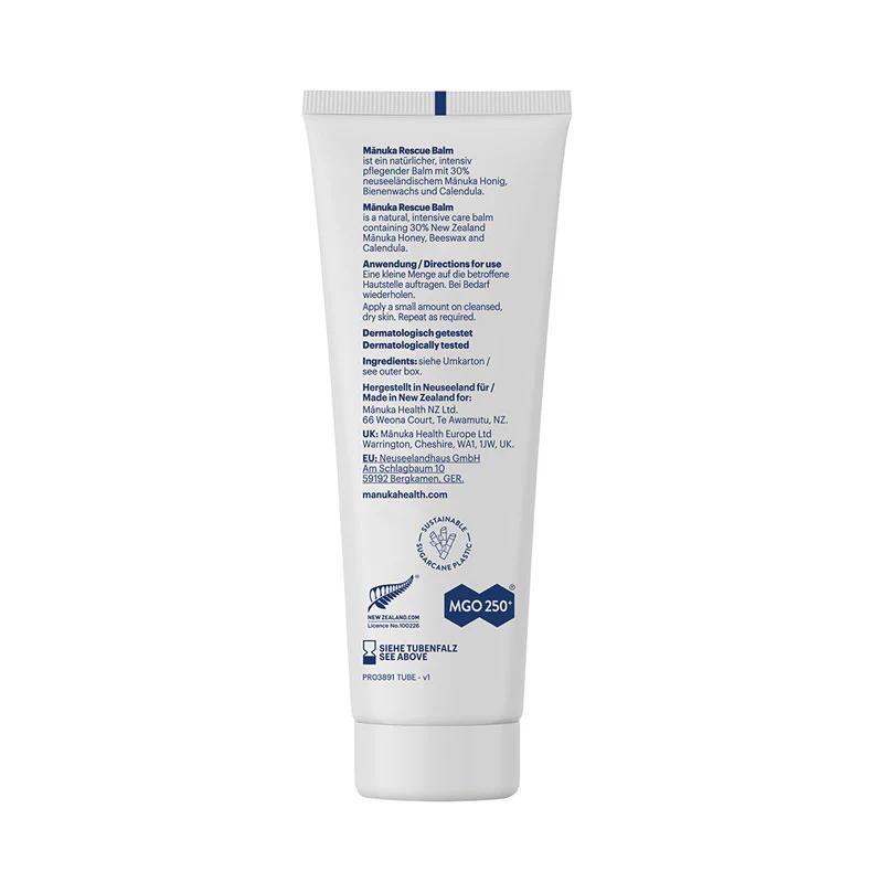 Regeneriert, pflegt und schützt die Haut, die hochwertige Manuka Rescue Balm Salbe von Manuka Health mit 30% wertvollem Manuka Honig aus der Natur Neuseelands, Calendula und Bienenwachs.