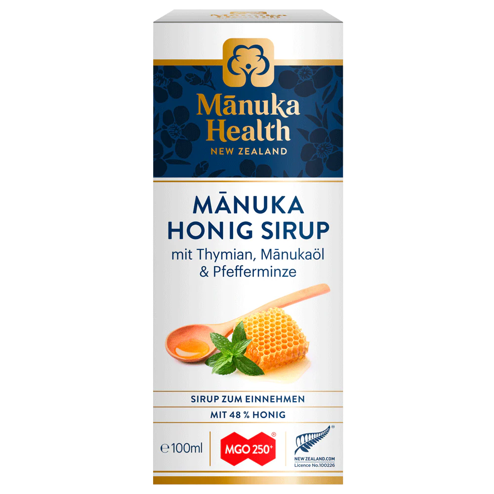 Der Manuka Honig Sirup MGO 250+ besteht zu 48% aus neuseeländischem Honig, jeweils zu 24% aus MGO 250+ Manuka Honig mit einem MGO (Methylglyoxal) Gehalt von mindestens 250 mg pro kg Honig und jeweils zu 24% aus Rewarewa-Honig. Unter anderem sind erlesene Zutaten, wie z.B. Anisöl, Thymianöl oder Pfefferminzöl enthalten.
