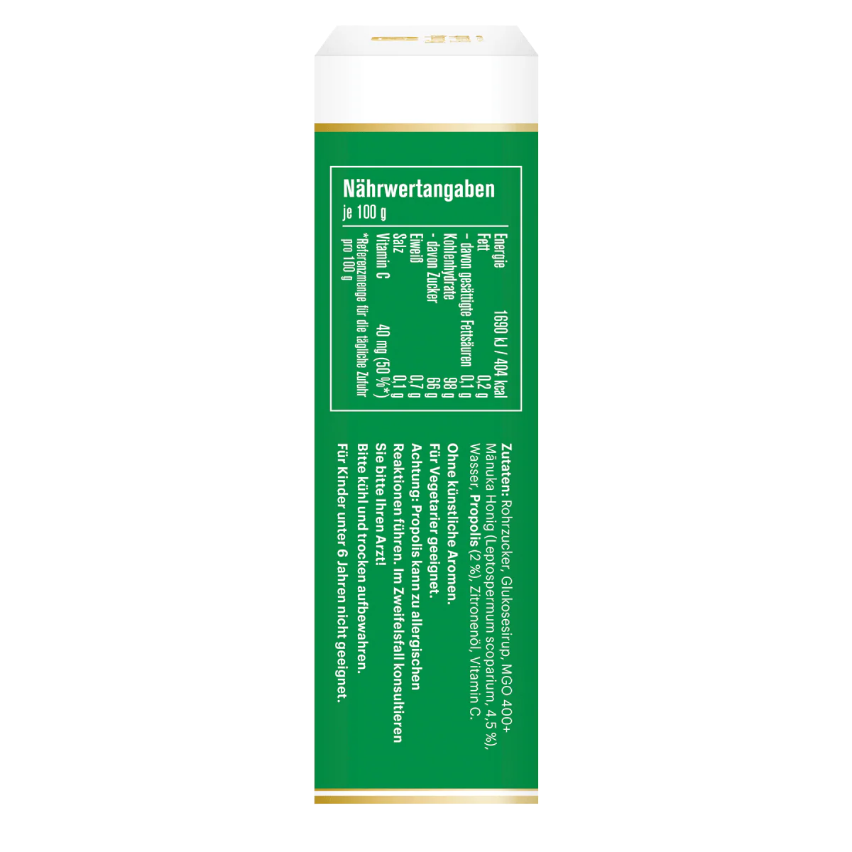 Natürliche und wohltuende Mānuka Honig Hustenbonbons mit Propolis Geschmack von Manuka Health mit besonderem neuseeländischem MGO 400+ Mānuka Honig mit einem MGO Gehalt von mindestens 400mg Methylglyoxal pro kg Honig und Vitamin C.